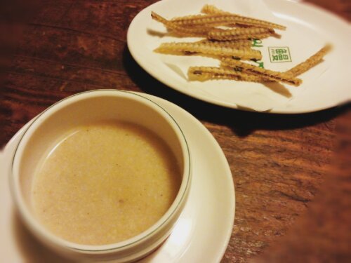 最初に出てきたのは、うなぎの骨を焼いたものと、うなぎのお粥です。