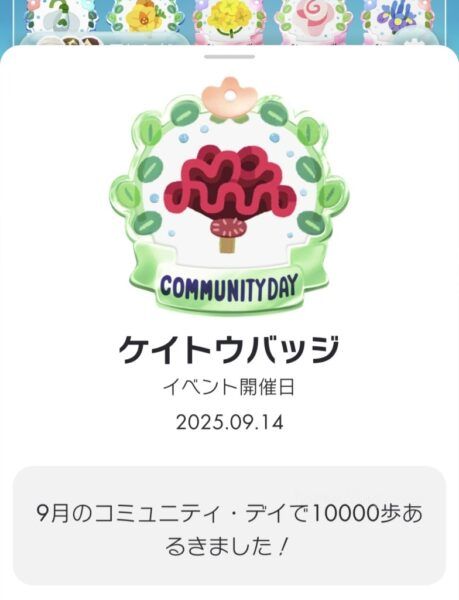 この日は公園歩いたりしたので、コミュニティデーのバッジも無事にゲット。