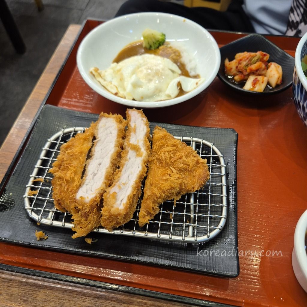 とんかつ+うどん+カレー+サラダ、日本料理のおみせだけど付け合せはやはりキムチ(笑)