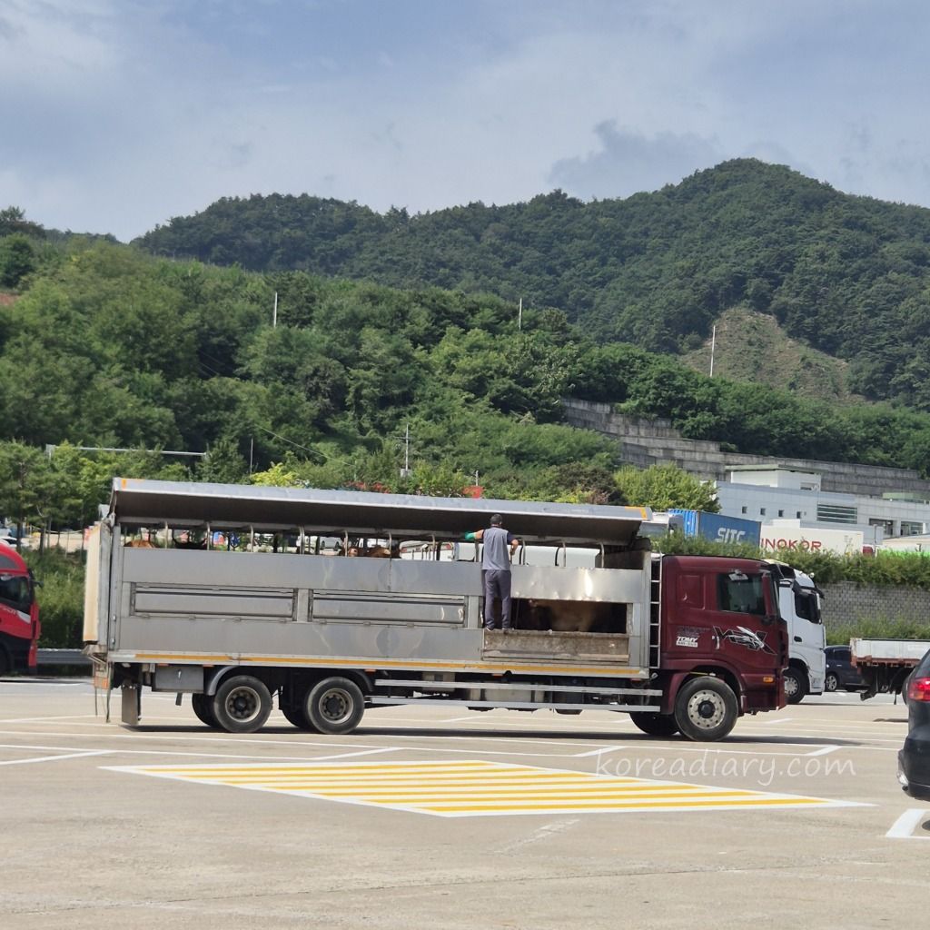 蔚山からの帰り道、高速休憩所で大きな牛のトラックと遭遇。