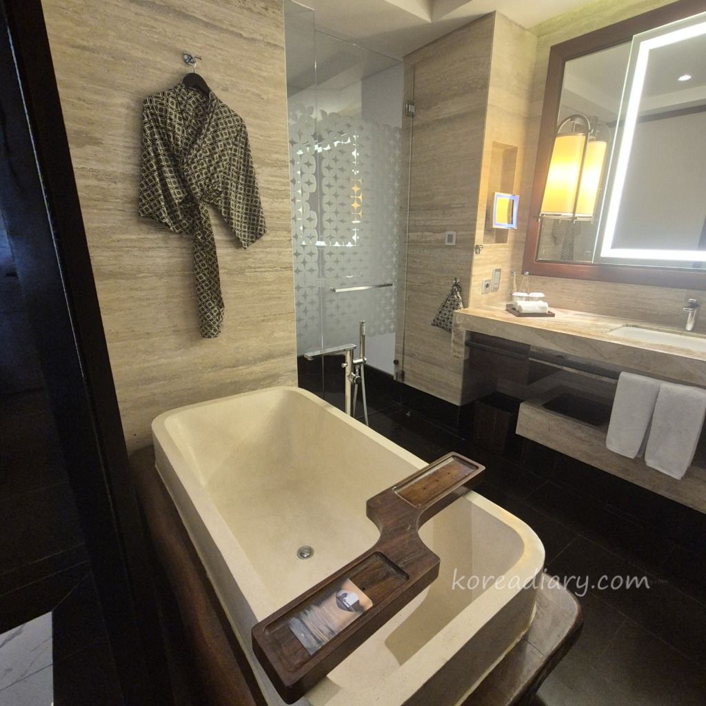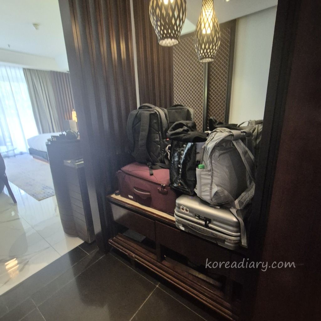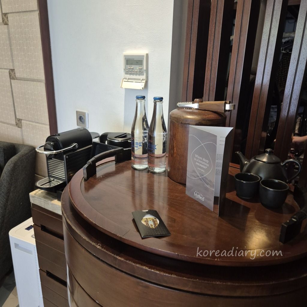 お水はこちらとバスルームにおいてあって、夕方のターンダウンサービスで追加を持ってきてくださいました。