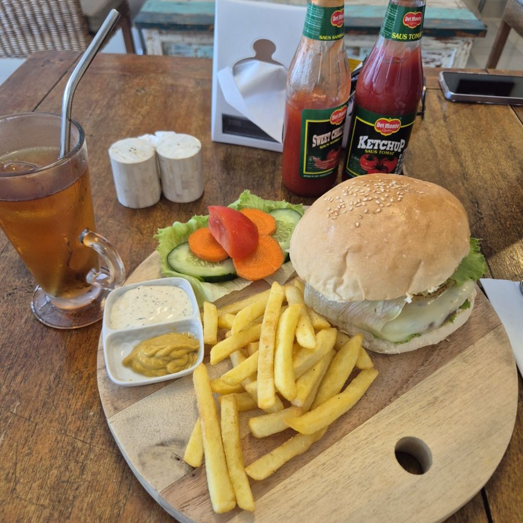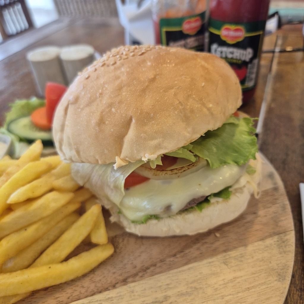チーズケーキだかチョコケーキだかを薦められたけど、私はお腹空いていたのでハンバーガーを。夫はアイスクリーム。