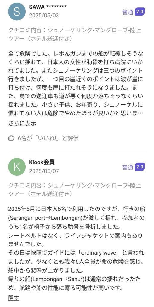口コミ通り、このツアーの船で怪我をする可能性もあるなと感じました。