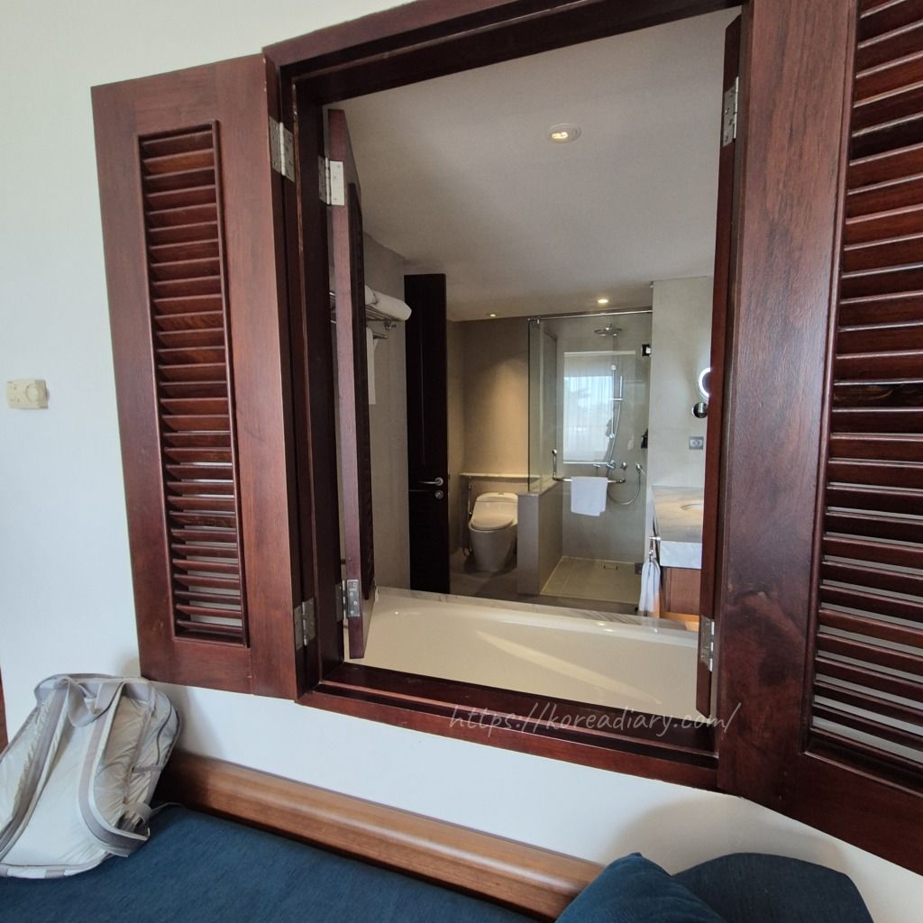 ベッドサイドの扉からバスルーム丸見えの構造。