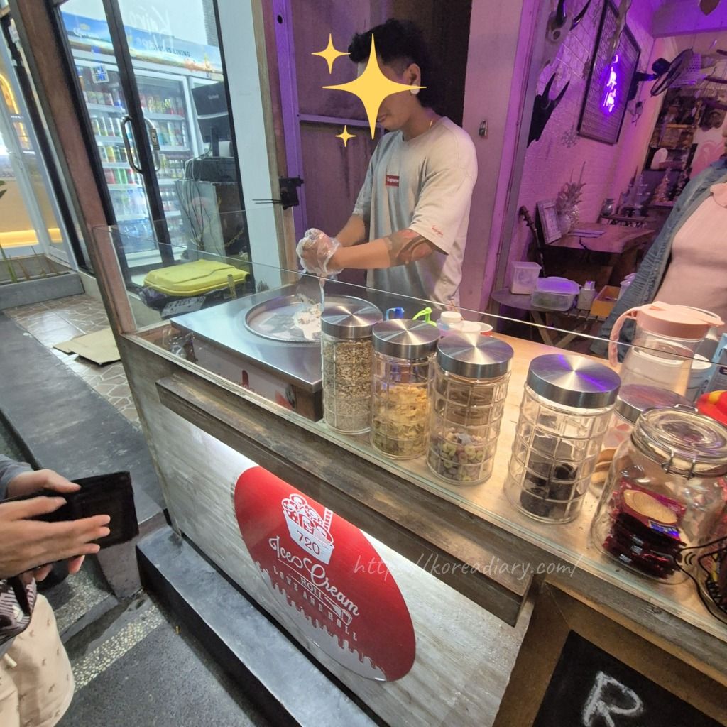 色んなフレーバーやトッピングがあって、冷えた板の上でアイスクリームとミックスしてくれるスタイル。