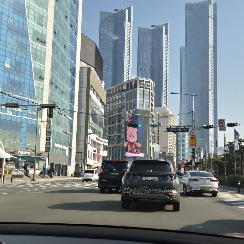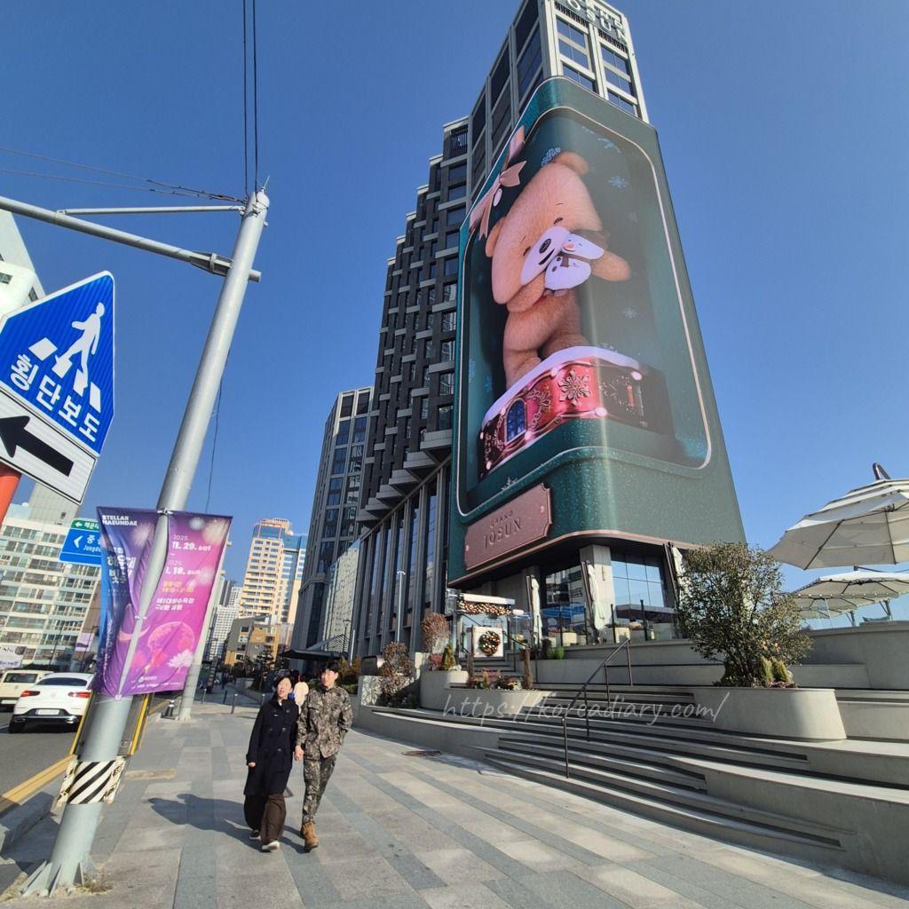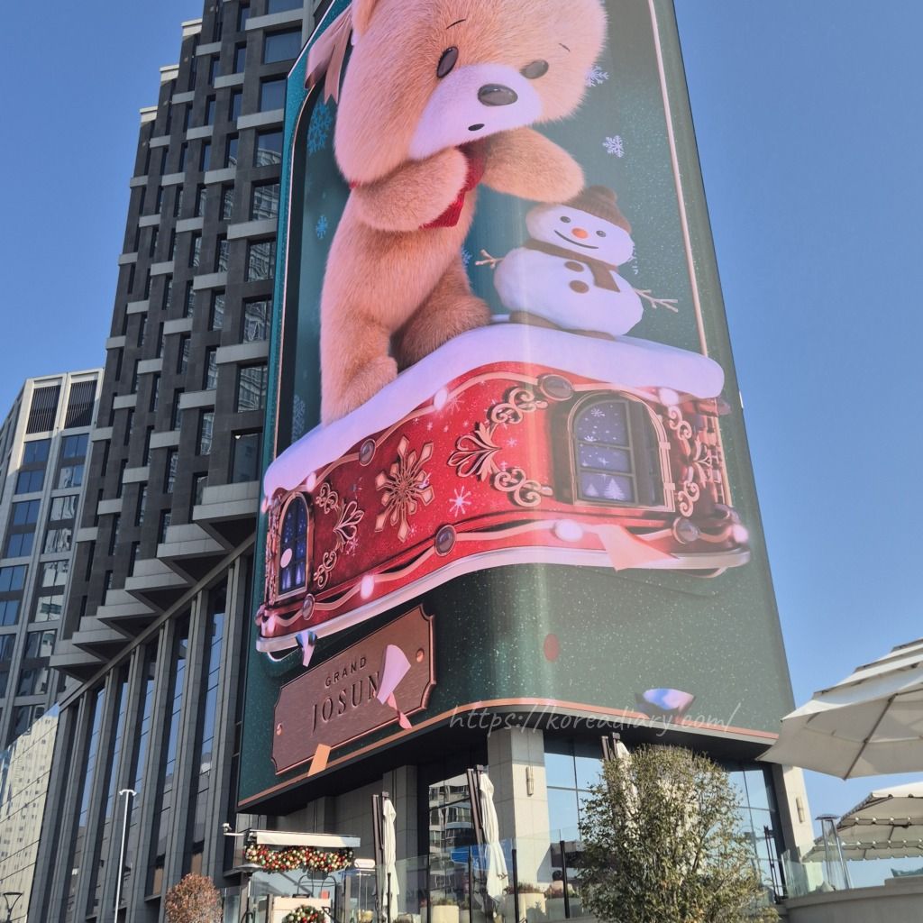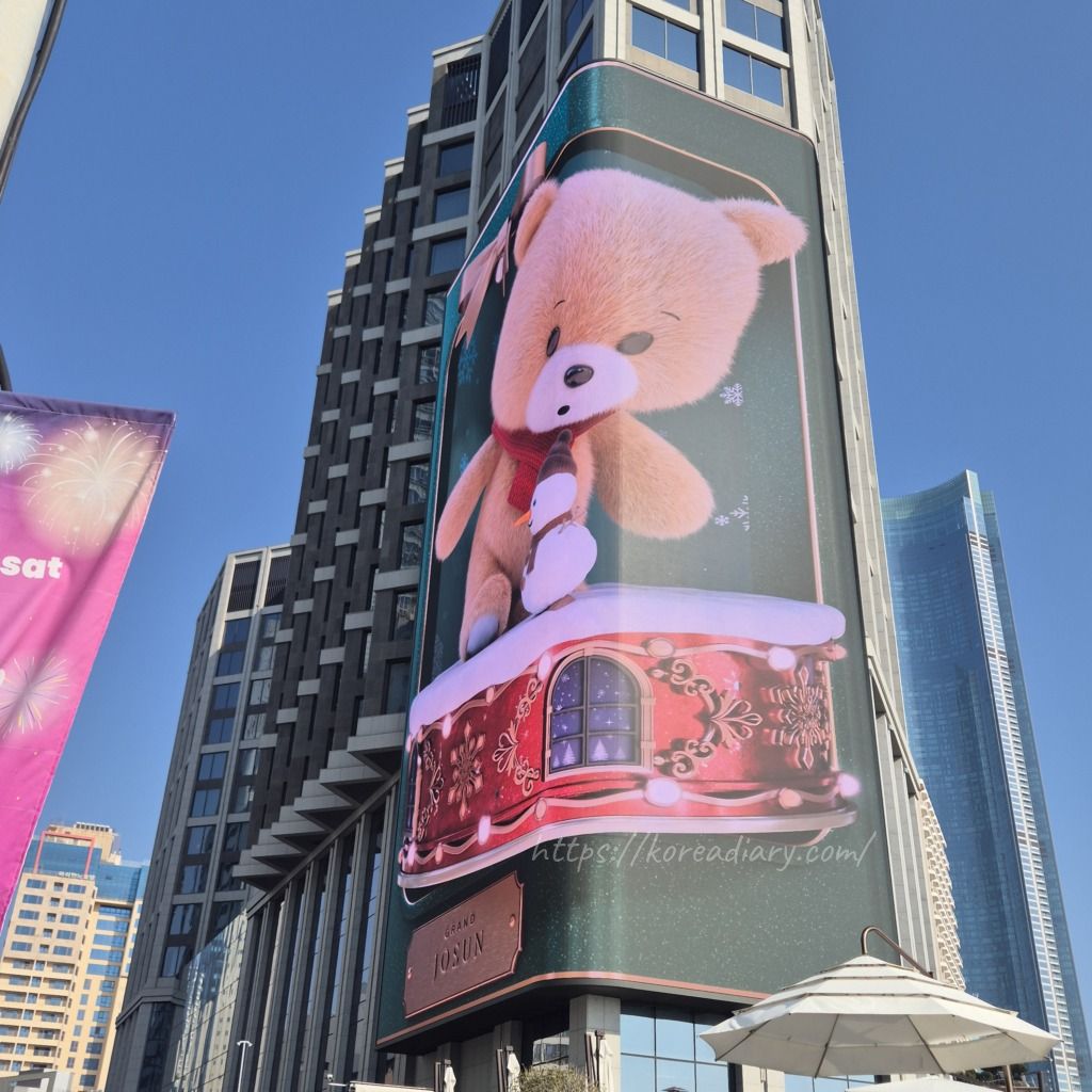 道路側の壁面には大きなディスプレイが設置されていて、グランド朝鮮のマスコットのクマが映し出されていました。