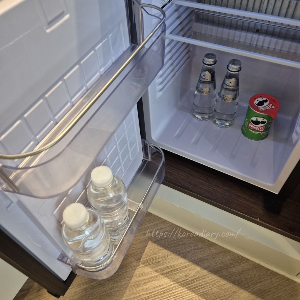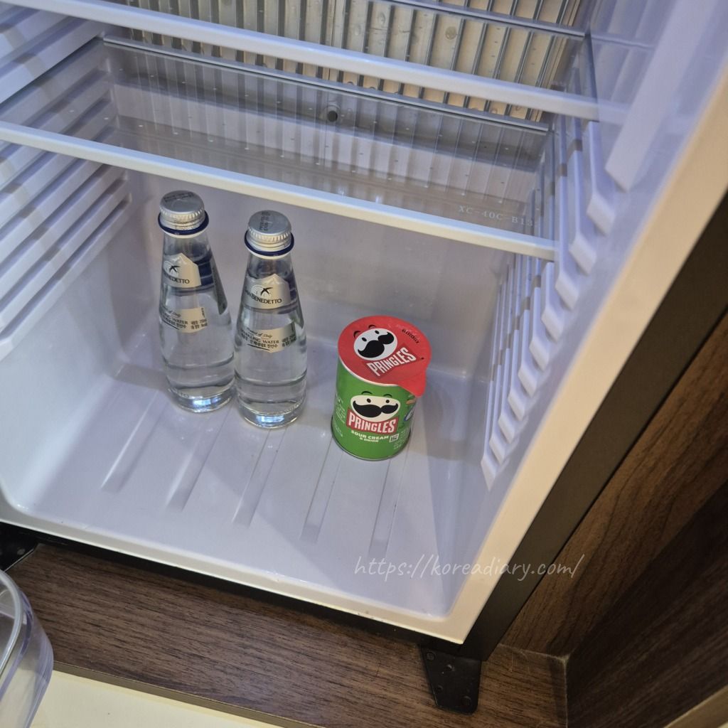 普通のお水と一緒に炭酸水、プリングルスが置いてありました。