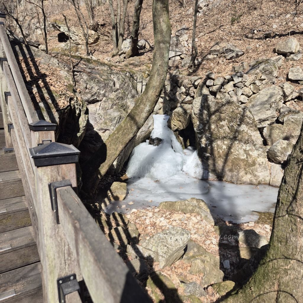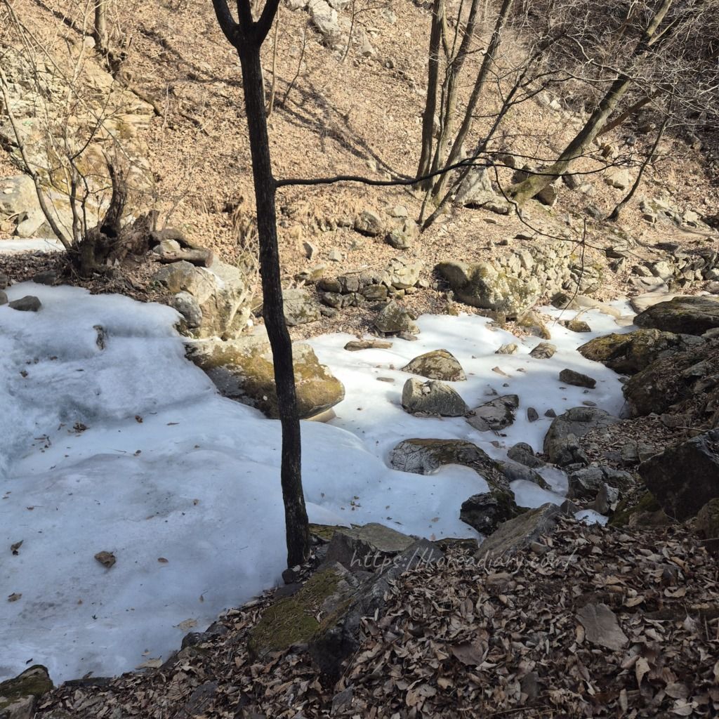 滝の近くは日陰の場所が多いので、まだ雪が氷がなって残っている。