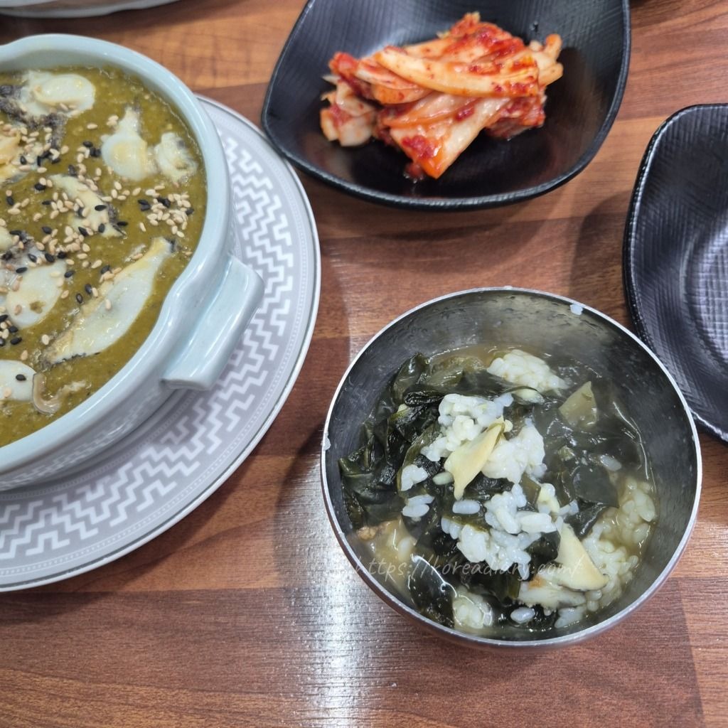 チョンボクチュッ(アワビ粥/전복죽)ってこんな色しているけど、これは多分アワビの肝の色。