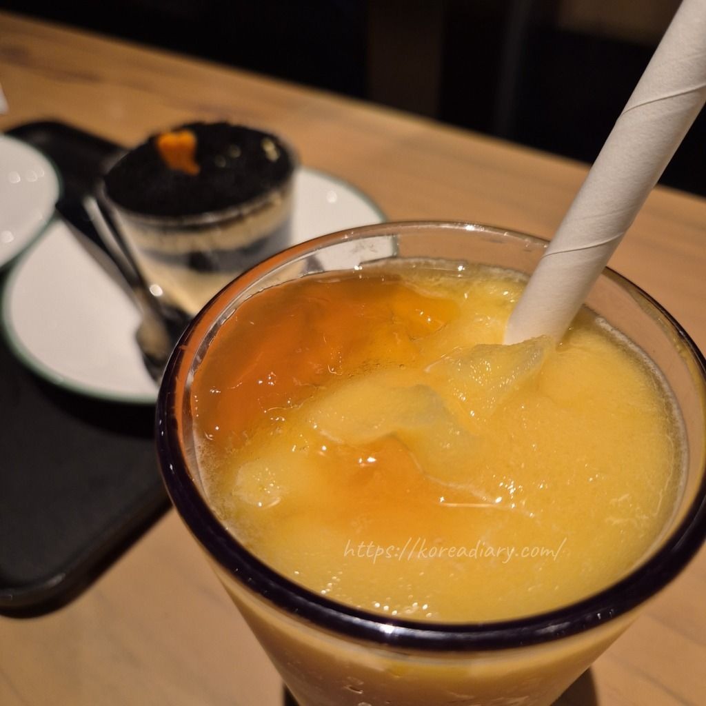私達が頼んだのは、済州島のハルラボンやチョネヒャンなどがブレンドされたみかんジュース。