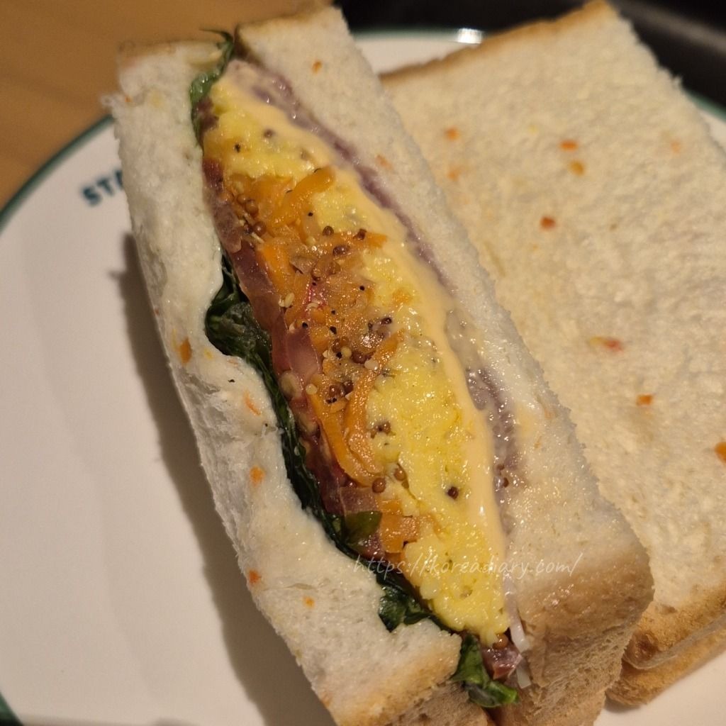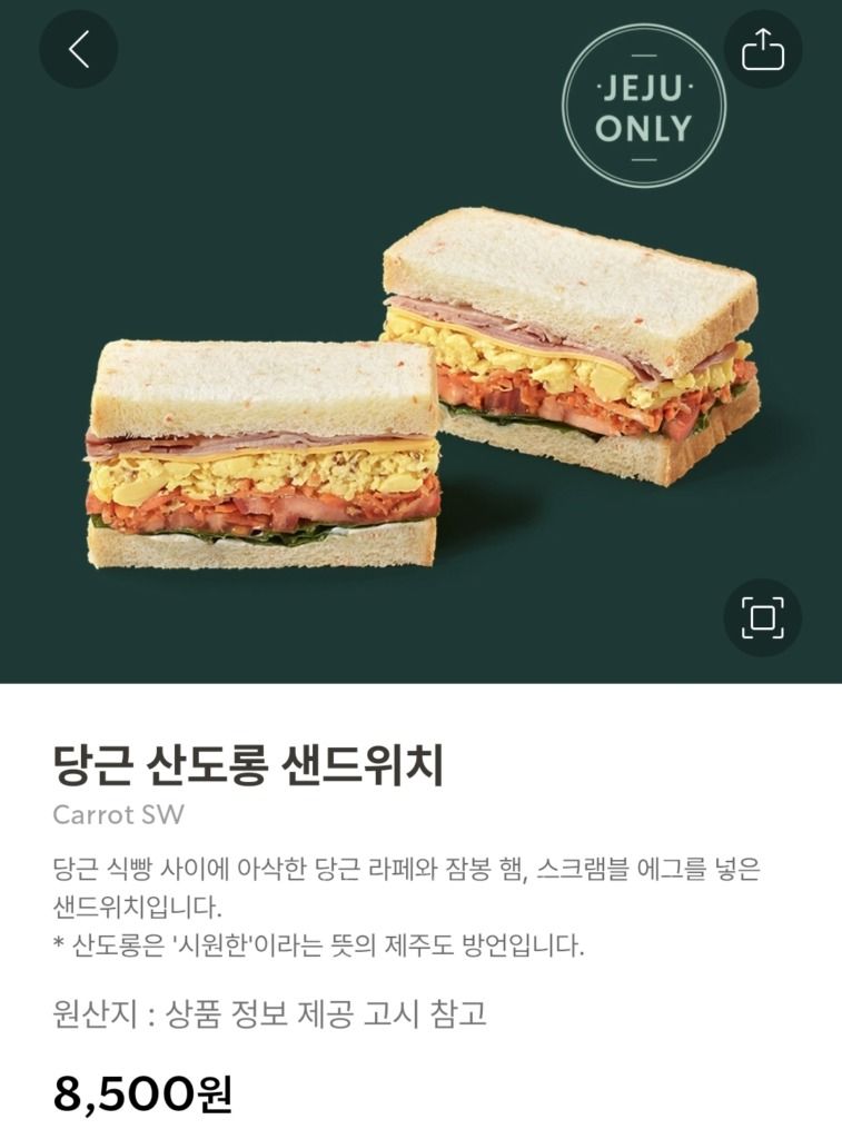 サンドイッチの名前にある”산도롱”は済州島の方言で標準語の”시원한(さっぱり)”と同じ意味らしい。