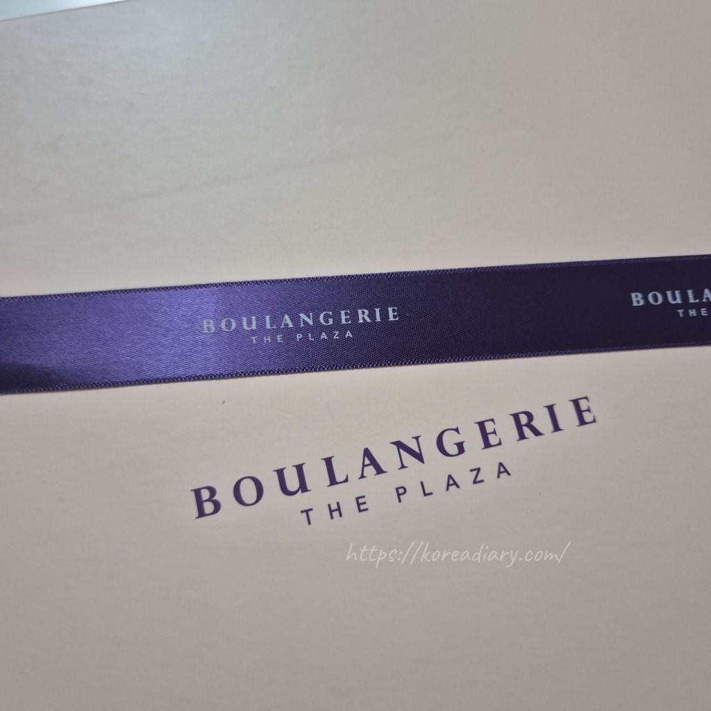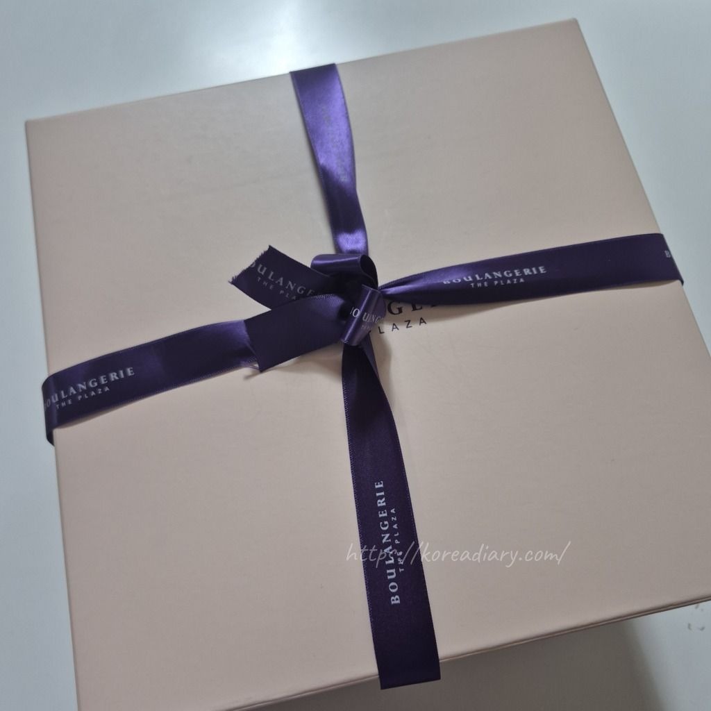 ケーキボックスと紫のリボンとの配色がおしゃれ。