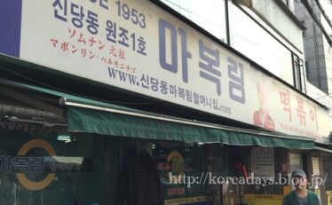 新堂洞トッポッキタウンでトッポッキランチ♪コネストに出ていたマボンリムハルモニチプに行ってきました。新堂(シンダン)駅から歩いてちょっとしたら着きました。韓国は伝統のある店が少ないから、伝統アピールのおばあちゃんの看板多いですよね・・・