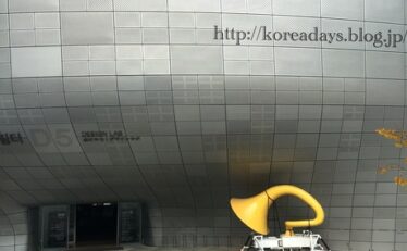 トッポッキを食べた後は、東大門デザインプラザに寄りました。日本でも話題になったザハ氏が設計した建物です。大きすぎて私のスマホでは全景は写せませんでしたので、コネストのページで見てください;-p