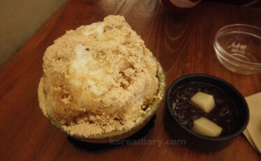 チョンガク駅近くのソルビンでピンス。雨がパラパラとしていた日だったので、お客さんは少な目でした。この季節はいつも混雑しているのでラッキー。注文したのはこの小豆などが入ったメロンピンス。メロンの実で蓋がしてあるので、ナイフで切り取ります~♪小...